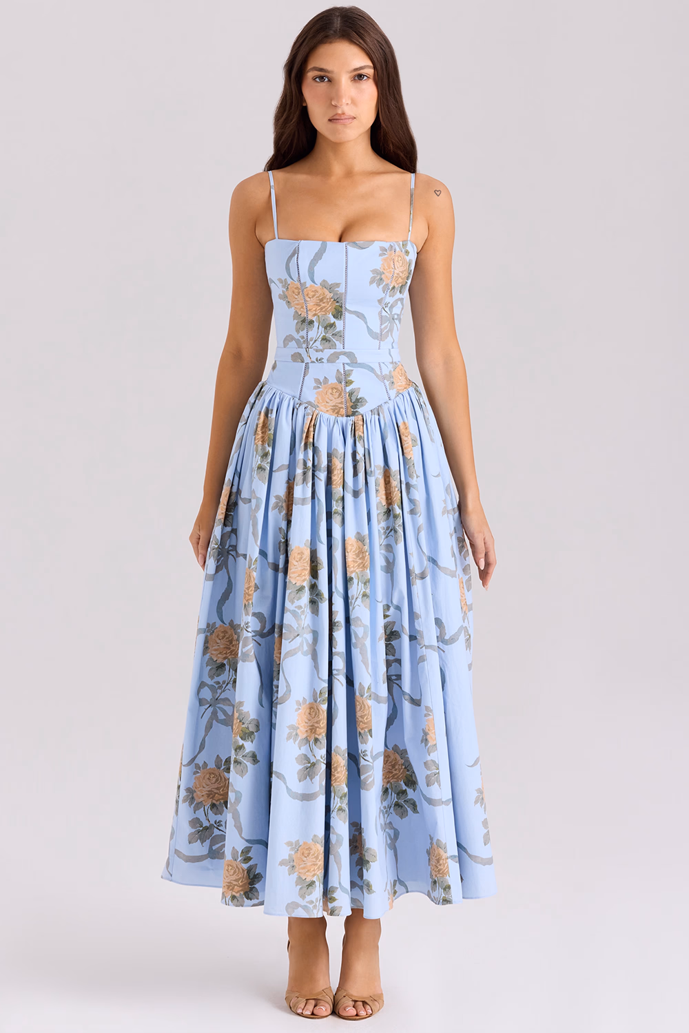 O corpete com recortes verticais alonga o tronco e define a cintura, enquanto a saia evasê midi cria movimento romântico e sofisticação. Combine com sandálias de salto nude e clutch delicada para eventos formais, ou rasteirinhas douradas e chapéu de palha para looks garden party.