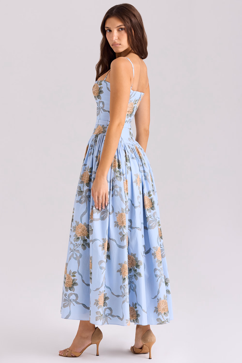 Esbanje romantismo e elegância neste vestido azul serenity rodado floral estampado midi. Em tecido fluido azul serenity com estampa floral de rosas em tons pêssego e verde, possui corpete ajustado estruturado e saia midi rodada. Perfeito para casamentos diurnos, festas de jardim, formaturas, eventos ao ar livre e celebrações especiais.
