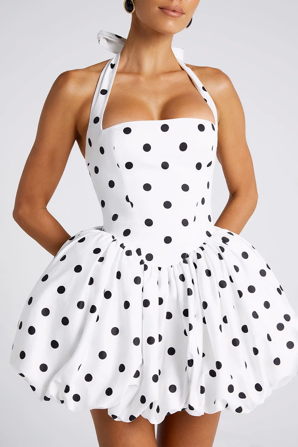 - Detalhes especiais: Estampa poá (bolinhas) clássica, barra da saia com acabamento arredondado tipo bolha, laço ajustável decorativo na nuca