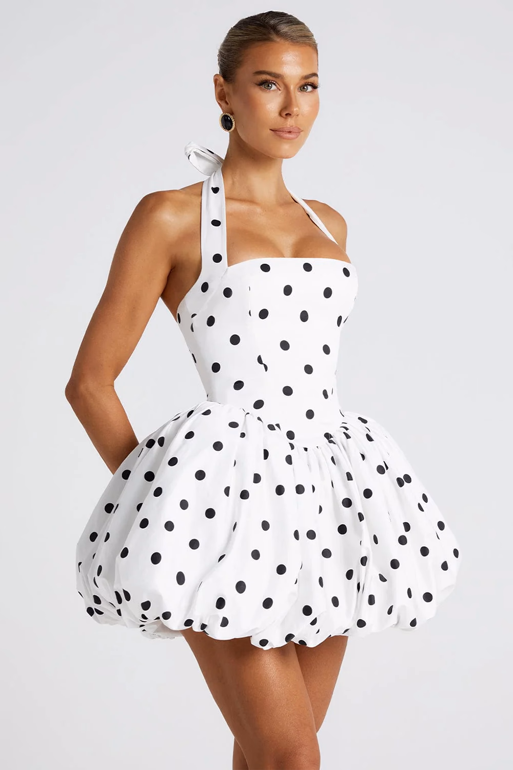 Seja a estrela da festa com o charmoso vestido curto branco rodado poá preto frente única festa. Este modelo vintage moderno em branco com poás pretos apresenta decote frente única com alças ajustáveis em laço, busto estruturado com lastex marcando a cintura e saia rodada volumosa estilo bailarina que cria visual lúdico e feminino.