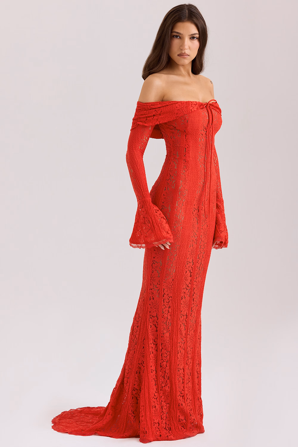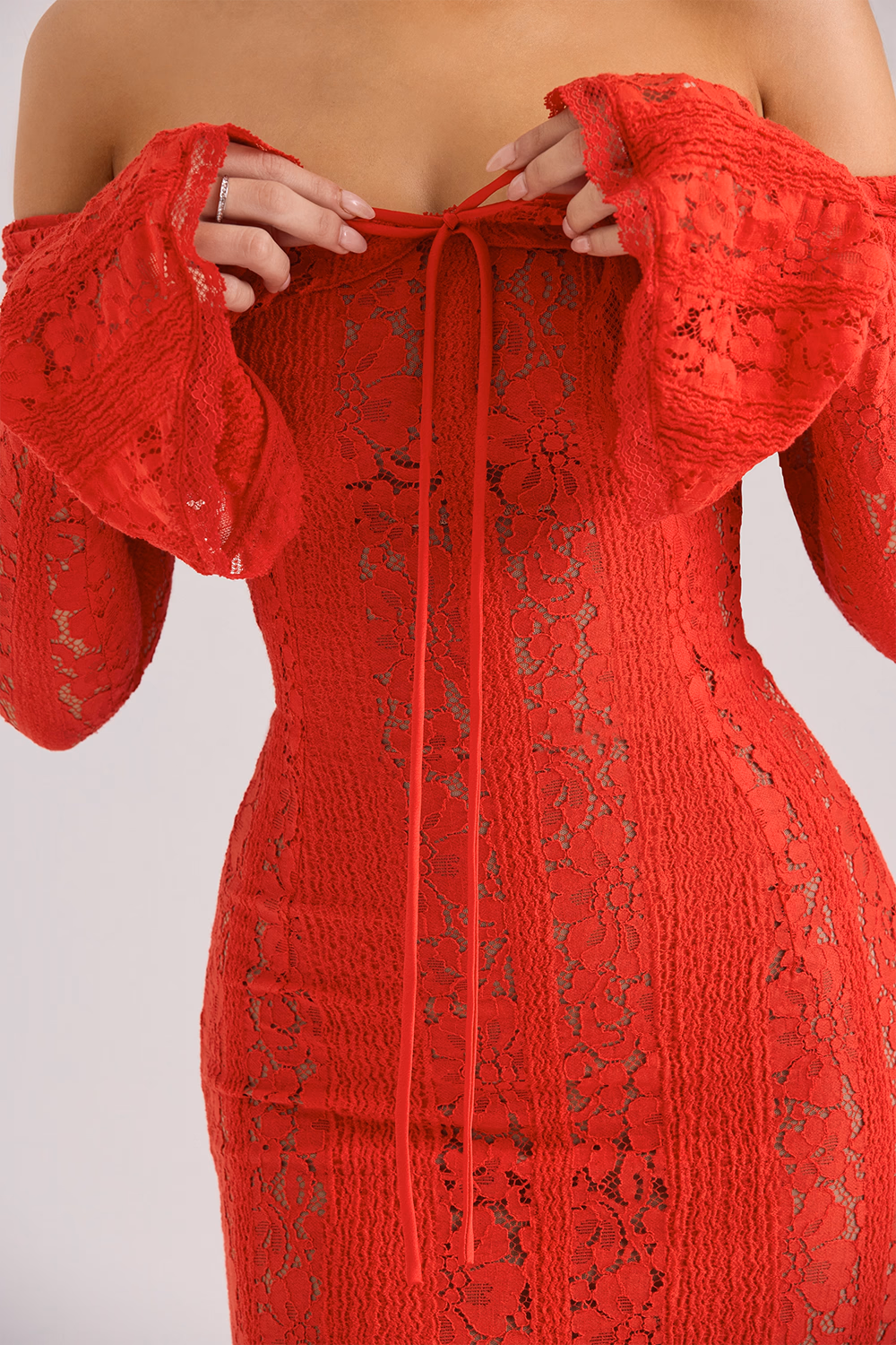 Roube a cena com este deslumbrante vestido longo vermelho renda ombro a ombro manga longa. Em renda floral vermelha intensa, une decote ciganinha com franzido duplo, mangas sino dramáticas e modelagem sereia ajustada que cria uma silhueta de pura elegância e sensualidade.