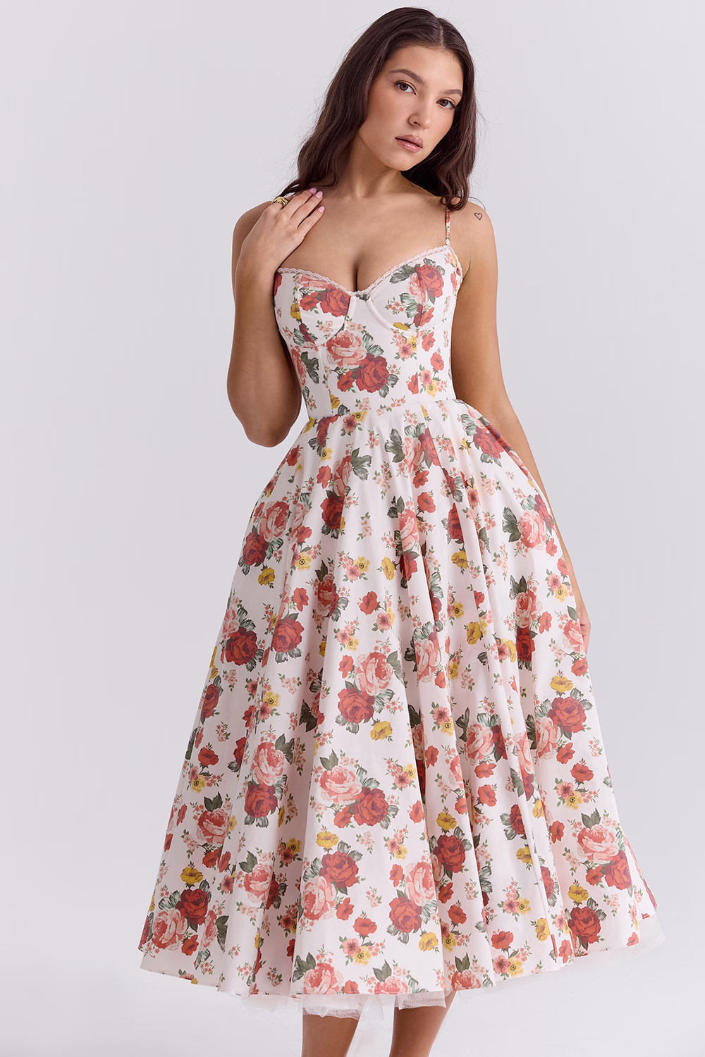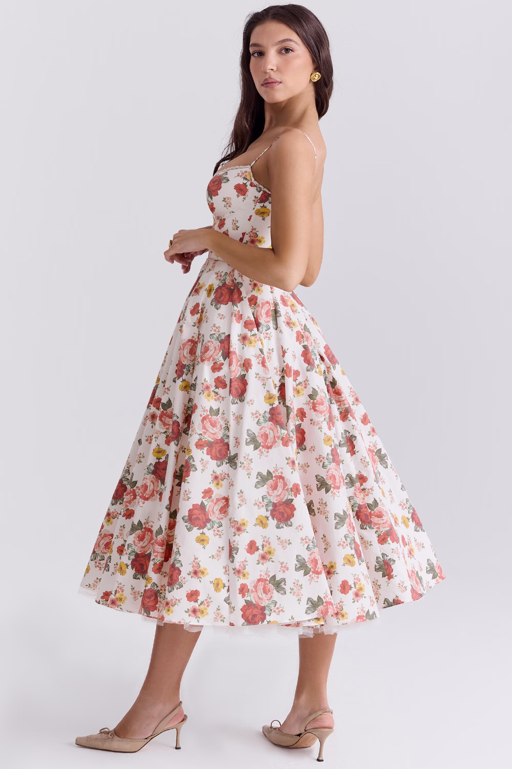 Encante-se com o vestido midi floral rodado estampado rosas vermelhas. Esta peça romântica apresenta estampa floral vibrante em tons de vermelho, rosa e amarelo sobre base branca, com corpete estruturado e saia rodada, perfeito para convidadas de casamentos diurnos, festas de jardim e eventos especiais.